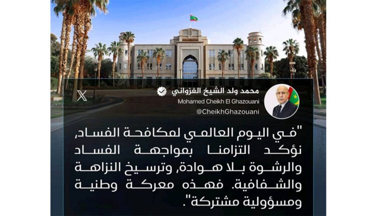 9 ديسمبر 2025/أكد رئيس الجمهورية السيد محمد ولد الشيخ الغزواني، خلال تغريدة على منصة (X)، التزامه بمواجهة الفساد والرشوة بلا هوادة، وترسيخ النزاهة والشفافية.