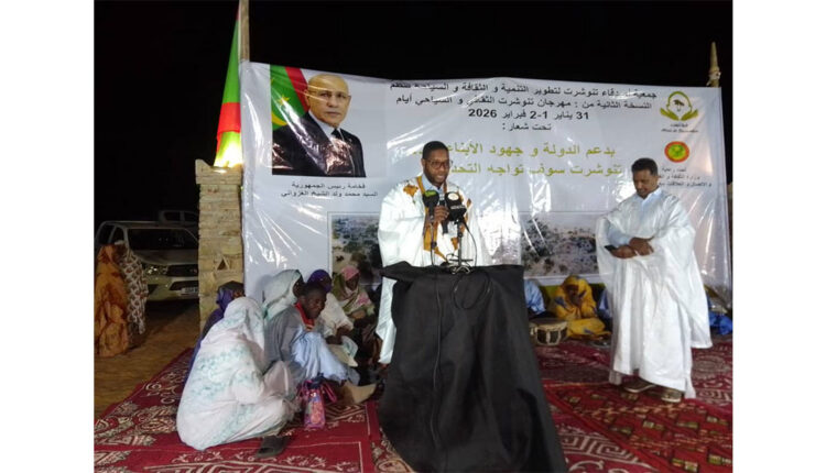 5 يناير 2026/أشرف معالي وزير الثقافة والفنون والاتصال والعلاقات مع البرلمان الناطق باسم الحكومة السيد الحسين ولد مدو, البارحة في بلدية بورات التابعة لمقاطعة مال، صحبة والى لبراكنة المساعد السيد سيدي محمد ولد عبد الله ولد البوناني، على افتتاح النسخة السابعة من مهرجان الثقافة والزراعة (مهرجان تقليت) المنظم من طرف منظمة التعاون عن طريق التنمية تحت شعار