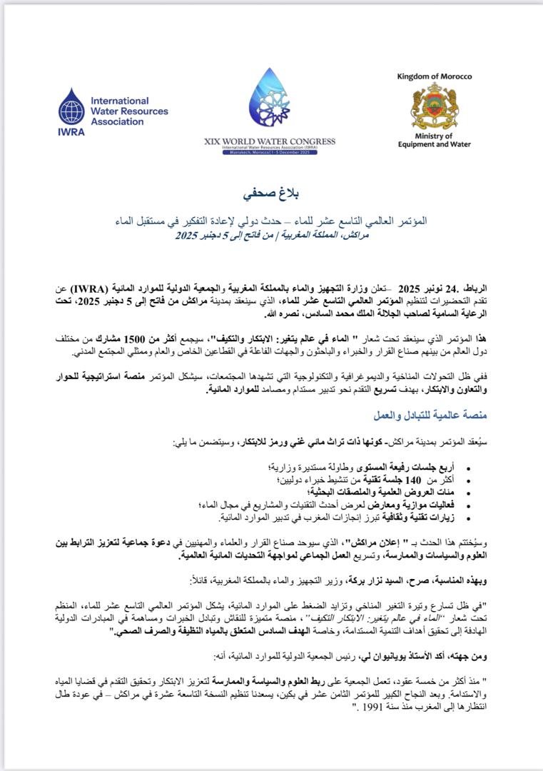 تعلن وزارة التجهيز والماء بالمملكة المغربية والجمعية الدولية للموارد المائية (IWRA (عن تقدم التحضيرات لتنظيم المؤتمر العالمي التاسع عشر للماء، الذي سينعقد بمدينة مراكش من فاتح إلى 5 دجنبر ،2025 تحت الرعاية السامية لصاحب الجلالة الملك محمد السادس ،