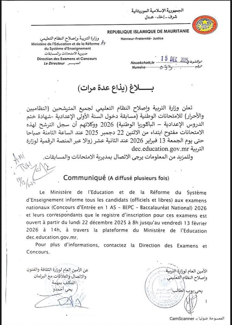 16 ديسمبر, 2025/الأخبار – أعلنت وزارة التربية وإصلاح النظام التعليمي عن فتح الترشح عن بُعد وذلك لجميع المترشحين النظاميين والأحرار للامتحانات الوطنية.